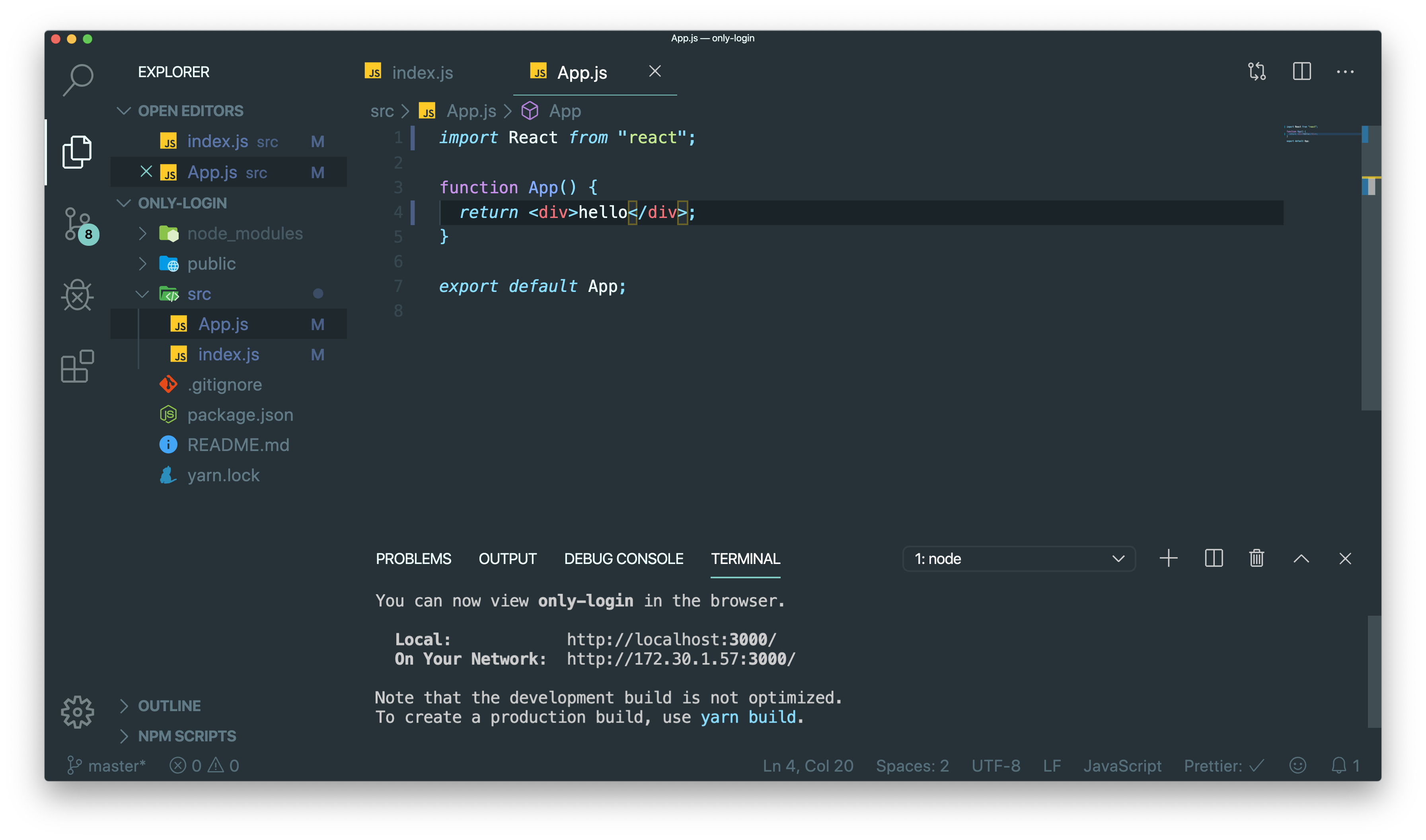 src 안에 기본적으로 세팅되어있는 부분을 다 삭제하고 App.js 와 index.js만 남겼다