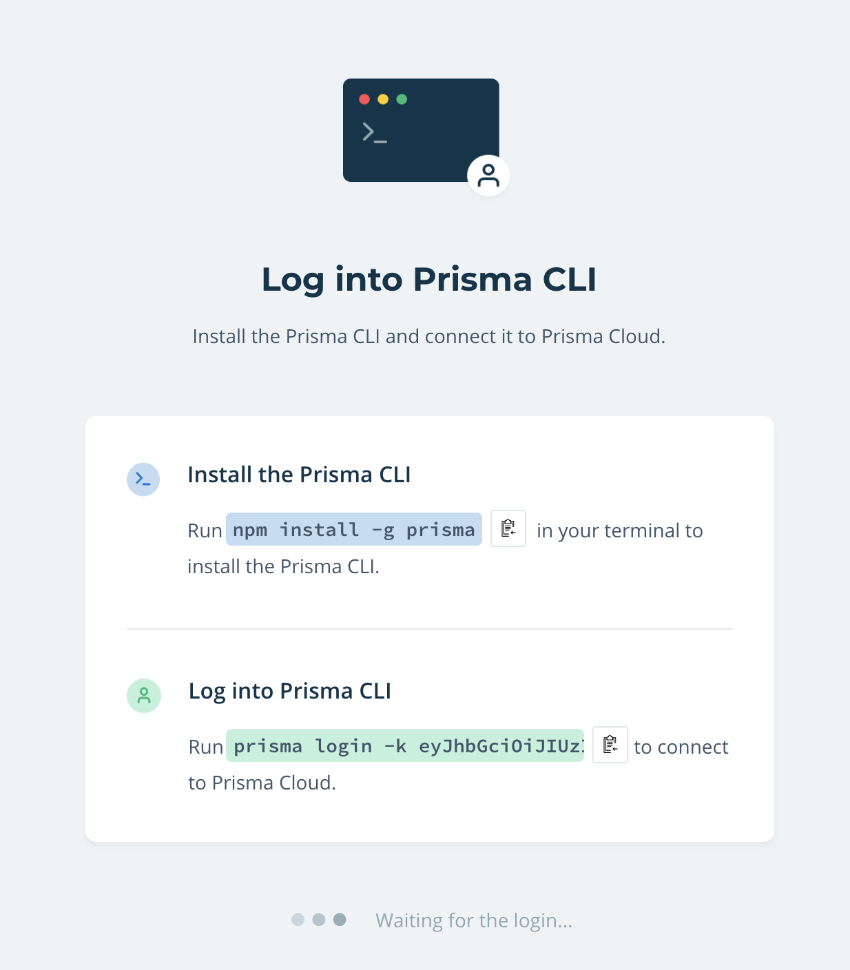 전역으로 설치 후 아래에 prisma login -k ~~~ 이 부분을 복사하여 enter를 누르면 아래와 같이 뜬다