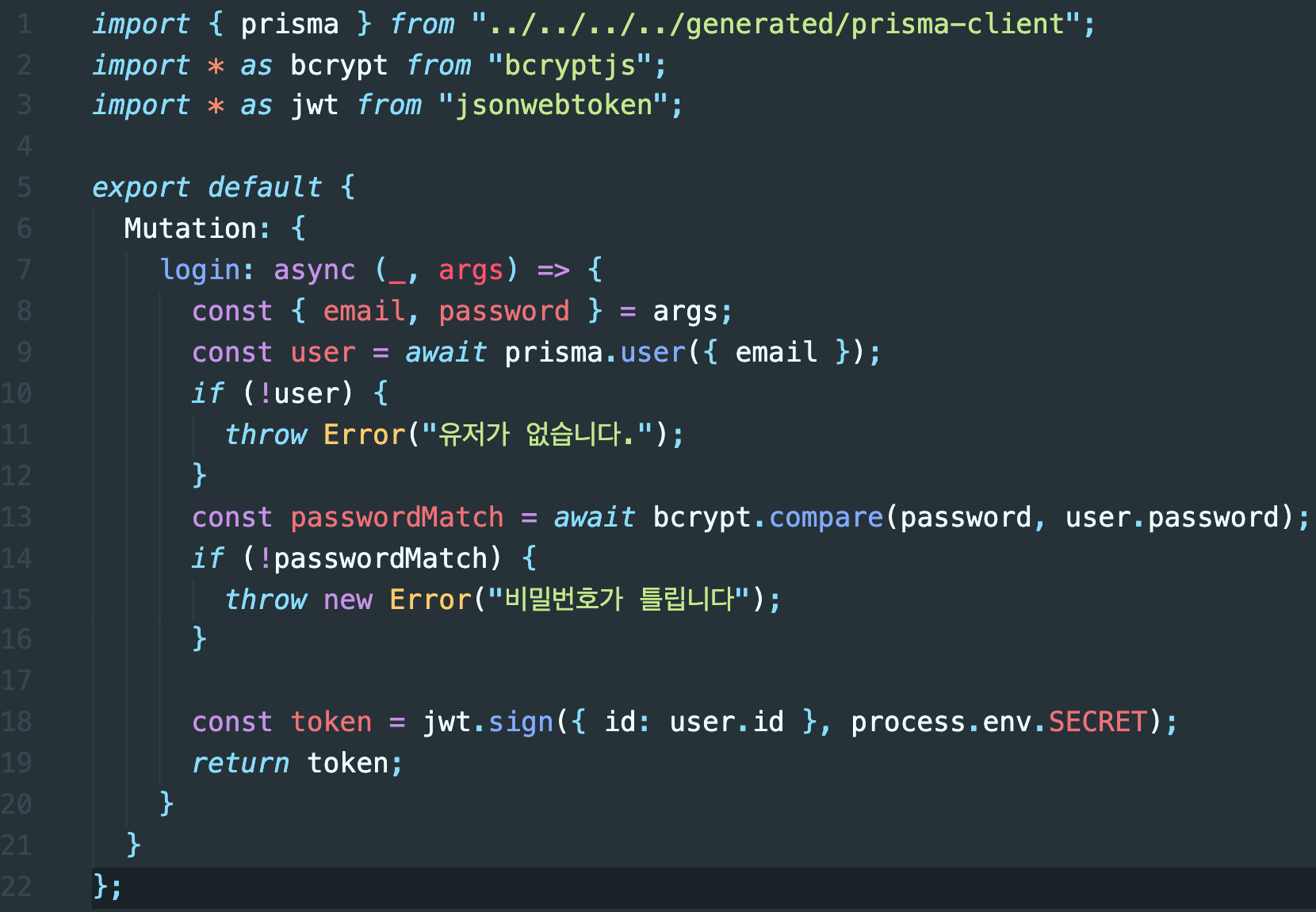 회원가입에서 create.graphql파일과 create.js 파일을 만들었다 로그인도 똑같은 형식으로 login.graphql 과 login.js 파일을 만든다 login.graphql은 회원가입과 똑같은 형식으로 한다 create.graphql를 모두 복사해서 몇개만 고쳐도 되지만 직접 써보면서 익숙해지는게 중요하다(직접) login.graphql에는 email과 password만 받는다 (로그인은 다른 사이트에서도 그렇게 하니까) 회원가입의 반환값은 참, 거짓이었지만 login은 jsonwebtoken을 반환해야 하므로 String을 반환값으로 준다 로그인 하기위해서는 모든 사이트에서 그렇듯 email(id) 이랑 password를 받아서 email(id)가 존재하는지 찾고 password가 일치하..